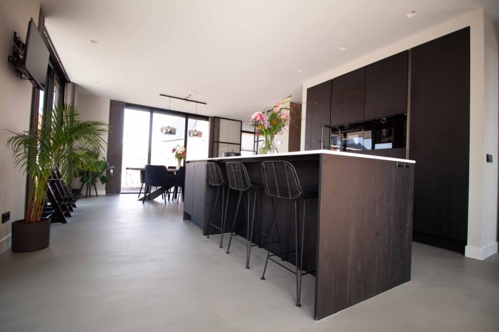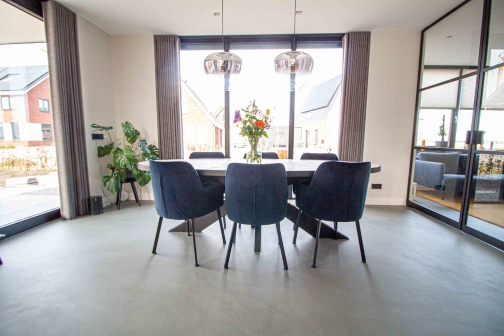De huiseigenaren wilden een betonlook vloer voor hun zelfgebouwde nieuwbouwwoning. Een vloer met een ambachtelijke en robuuste uitstraling. De vloer moest tegelijkertijd onderhoudsarm en geschikt zijn voor natte ruimtes, zoals een keuken.