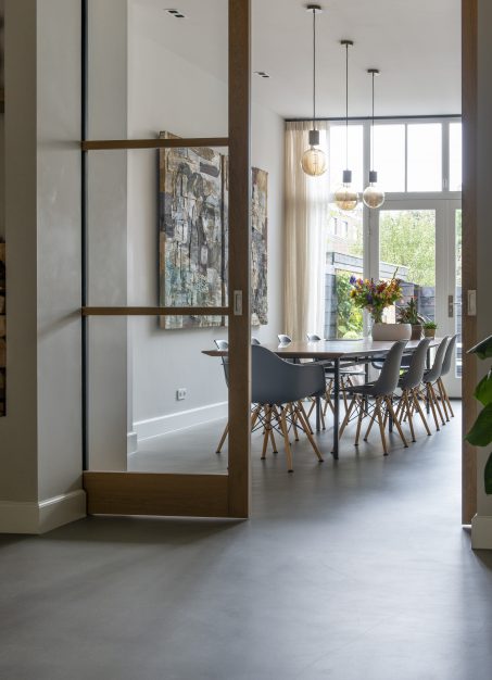 Nadat alles in de woning was gedaan, werd de betonlook vloer aangebracht. “We hadden al onze intrek genomen op de eerste verdieping, dus we hebben alles kunnen meemaken,” vertelt Esther. “Met elke laag die werd aangebracht, werd ons huis een beetje mooier. In de hal hebben we de originele Granito vloer laten restaureren en daar sluit de Corestone Classic vloer prachtig op aan. De vloer is een lust voor het oog én voor onze voeten en maakt ons huis helemaal af.”
