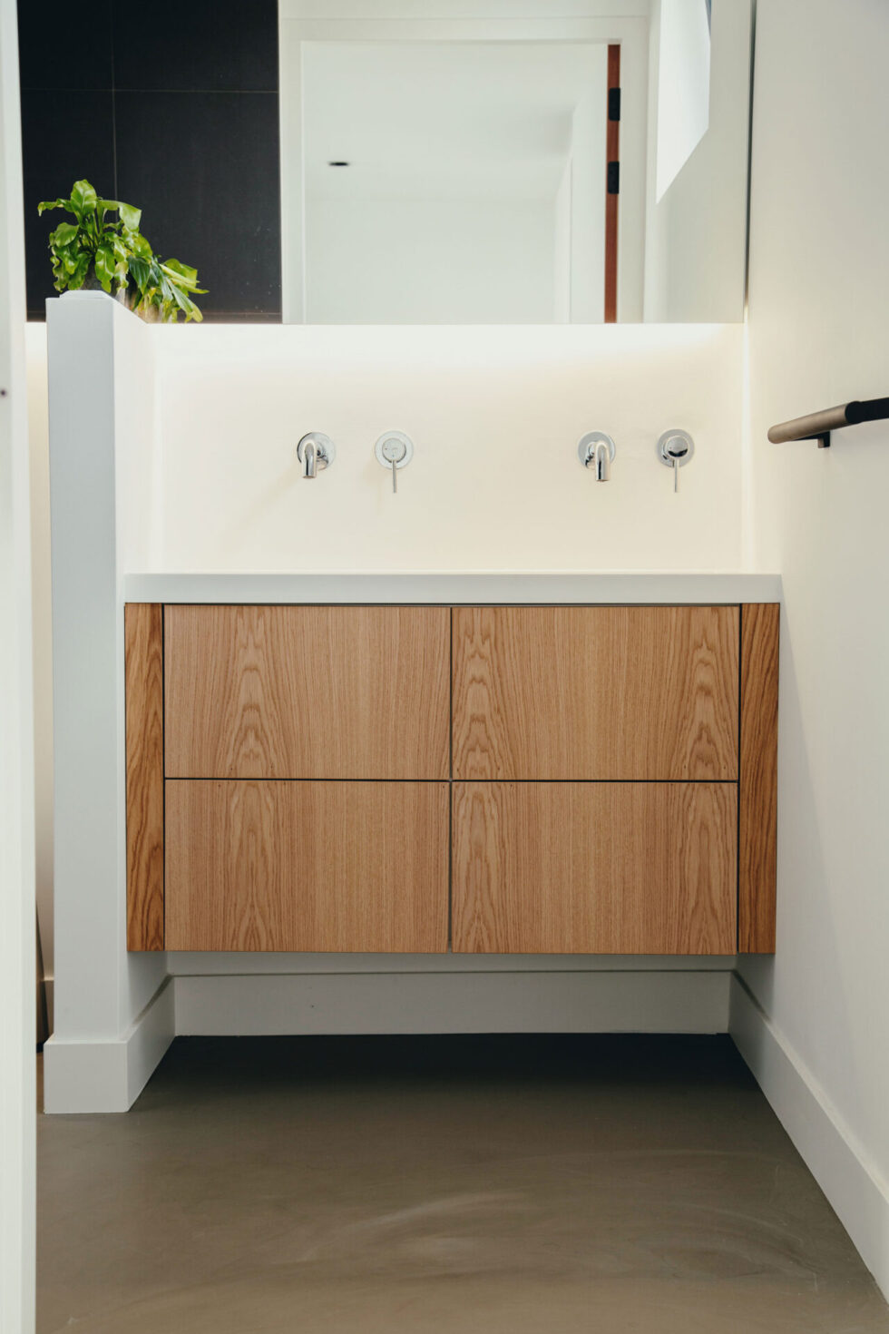In de badkamer is er voor gekozen om de vloer naadloos door te laten lopen: “In de badkamer hebben we de blend laten afwerken met een stroefheidsfractie. Je ziet er niets van, maar zo’n antislipbehandeling zorgt er wel voor dat je niet uitglijdt.” De combinatie met vloerverwarming zorgt in de badkamer voor extra comfort. “Ook met blote voeten is het heerlijk warm om op te lopen.”