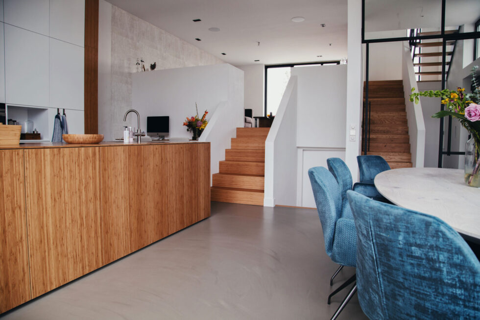 Familie Smits ontwierp het huis samen met AL architectuur. Sommige ruimtes in de woning zijn behoorlijk hoog, waarvan enkele ruimtes tot wel vier meter hoogte. Fam. Smits: “Daarom was het voor ons belangrijk om een vloer aan te brengen die een positieve bijdragen levert aan de akoestiek. De Superbase gietvloeren van EPI beschikken over alle eigenschappen die wij belangrijk vinden. We zijn superblij met dit resultaat.”